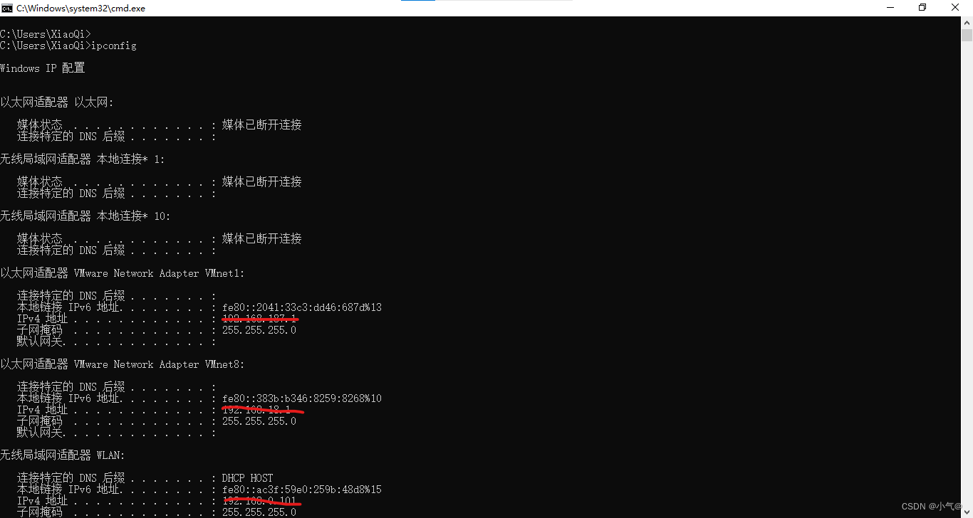 - Ipconfig+回车用于查看自己的ip地址
