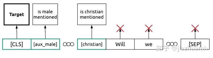 图中 Target 是比赛要预测的目标,is male mentioned、is christian mentioned 等是一些辅助目标,通过这些辅助目标提供的监督信号,也可以对模型的训练和最终效果提供帮助。
