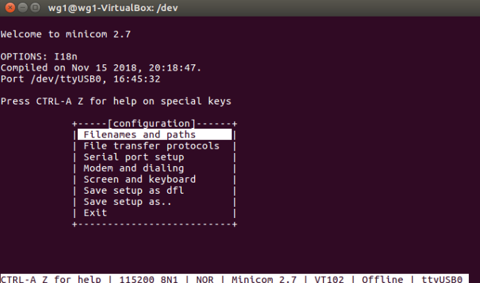 (3)成功检查到串口ttyUSB0之后,进行minicom串口的配置,终端输入命令sudo minicom按ctrl+A进入配置模式,再按O键,进入如下图3-15配置
