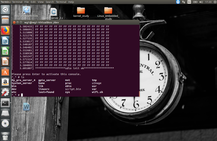 (5) 然后按Enter建退出,再选择Save setup as dfl保存本次配置修改为默认,之后选择Exit退出,这样之后串口调试配置就完成了。将orange pi lite 开发板电源线插上就可以通过minicom进入之之前移植好的Linux系统了。这样就可以通过ubuntu系统终端进入板上系统了。结果如下图3-17所示