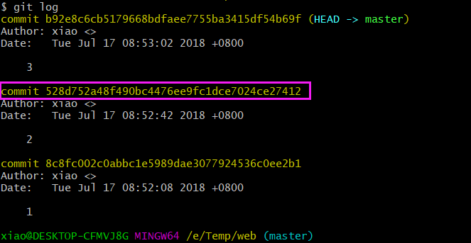 git init git add . git commit -m "1" 修改文件内容为2,再次提交 git add . git commit -m "2" 修改文件内容为3,再次提交 git add . git commit -m "3"