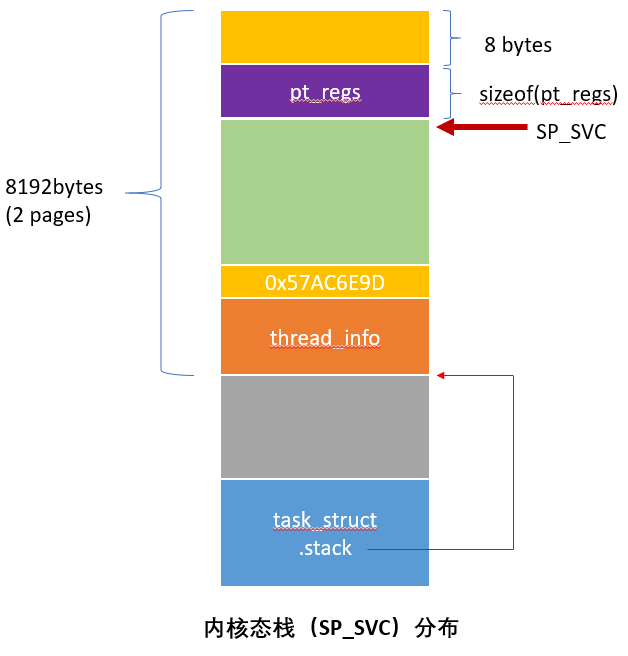 task->stack 为thread_info,在task_struct之后,故,内核态堆栈的位置如下: