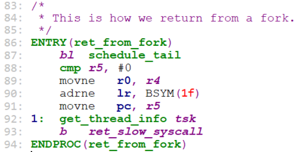 最后(305行)通过movs pc, lr指令,返回fork()的下一条指令。特权模式在298行的时候就恢复为fork()之前的值了。