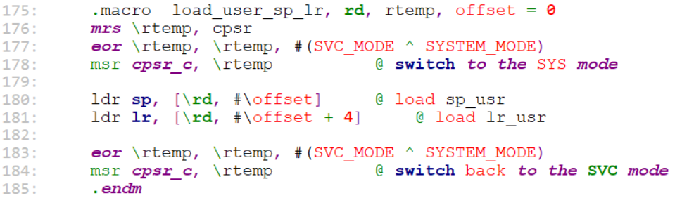 177行,先切到system模式,system模式和user模式共享sp_usr;然后180行从内核态堆栈rd后面的pt_regs.sp中取出用户态堆栈,并设置到sp寄存器(sp_usr寄存器,由于此时是用户态模式,sp为sp_usr,而非sp_svc);接着181行取出用户态的lr,并设置到lr_usr,这样,一旦模式切换到用户态, move pc, lr,pc就是用户态堆栈中保存的lr了,即用户空间下一条指令。
