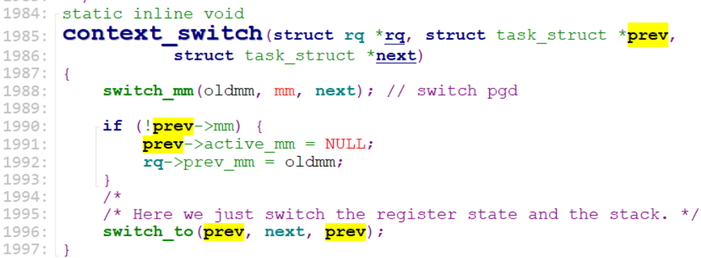 context_switch()调用switch_mm切换进程页表, 然后调用switch_to()加载task的pc, sp等寄存器。