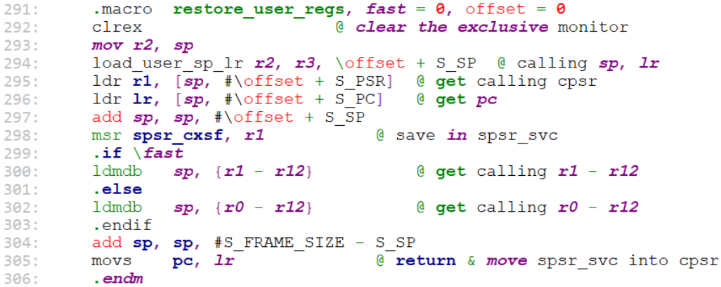 restore_user_regs调用load_user_sp_lr,将sp切到pt_regs.sp,lr切到pt_regs.lr.