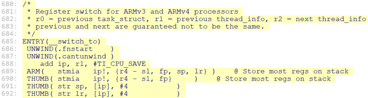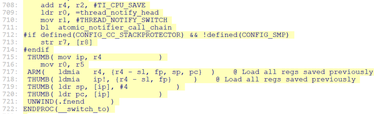 708行,r4指向新创建的task的thread_info中的cpu_context_save结构,即r4 = &task.stack. cpu_context, 所以717行加载这个结构里面保存的各寄存器的值后,sp指向了前面图示的位置,pc则指向的是ret_from_fork。