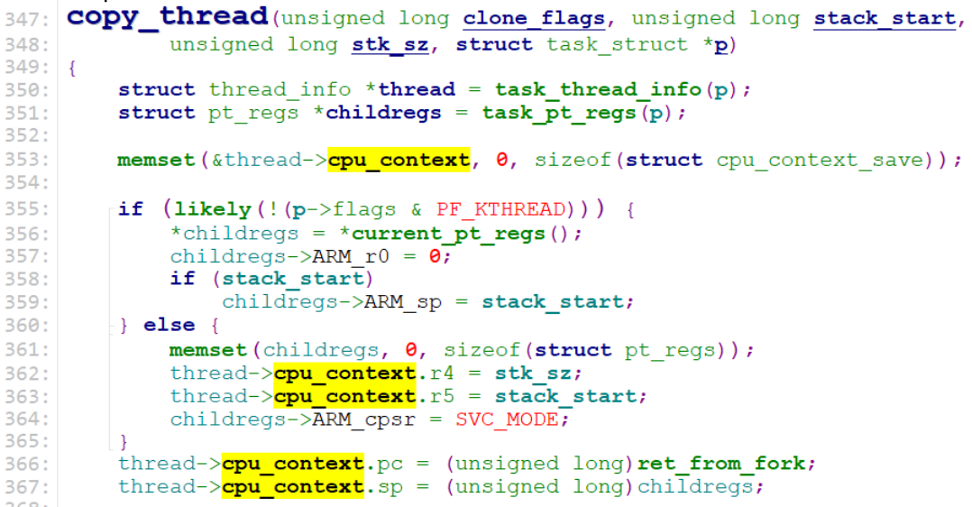 本文基于ARM来学习,这里copy_thread()定义在linux-3.11.1/arch/arm/kernel/process.c