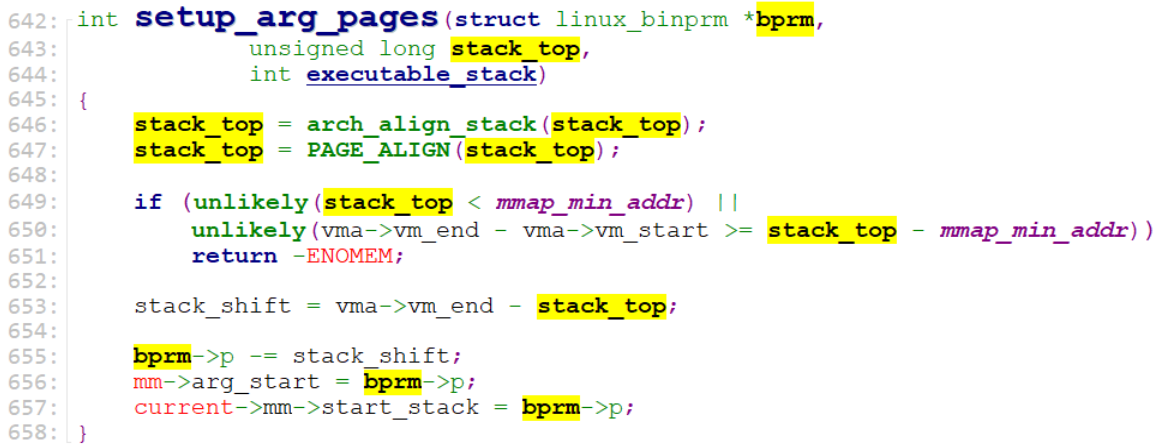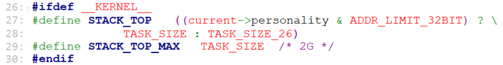 load_elf_binary()调用setup_arg_pages()设置bprm->p(这个就是用户空间堆栈的位置),这里STACK_TOP为2G. randomize_stack_top(STACK_TOP)为2G-16M.