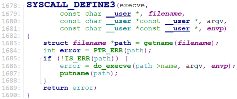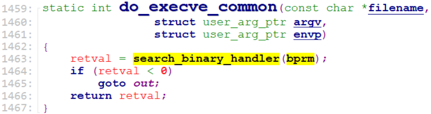 SYSCALL_DEFINES(execve) -> do_execve() -> do_execve_common() -> search_binary_handler() -> load_elf_binary()