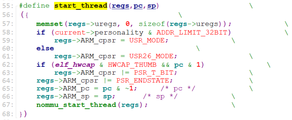 start_thread()更新了当前进程的pt_regs中的寄存器pc, sp, cpsr.这样,下次schedule的时候,就是运行pc指向的elf_entry处的函数(main)了。