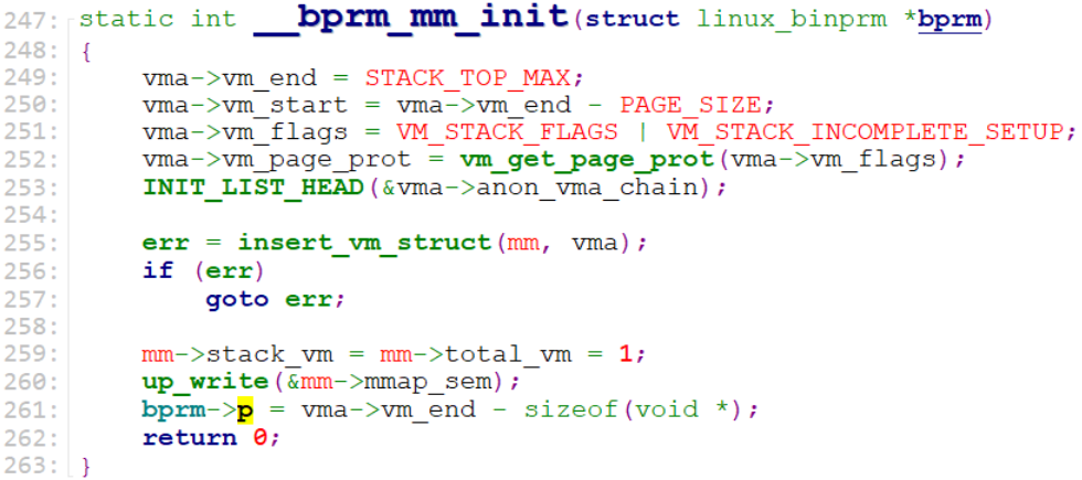 bprm->p在__bprm_mm_init()初始化为STACK_TOP_MAX(2G).