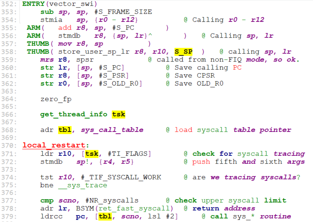 注意,此时为SVC模式, sp为sp_svc,vector_swi首先保存现场,拿到系统调用号,368行加载系统调用表sys_call_table,379调用系统调用程序,这里为sys_execve()。