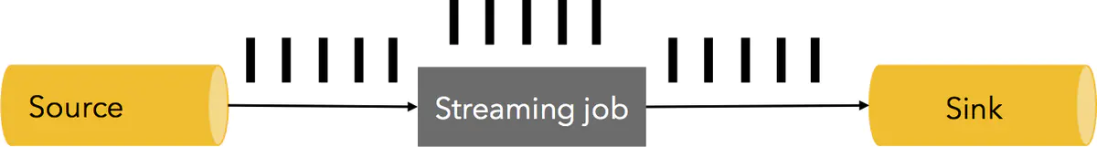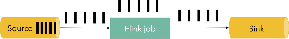 看一个简单的例子。假设数据流 pipeline(抽象为 Source,Streaming job 和 Sink)在稳定状态下以每秒500万个元素的速度处理数据,如下所示正常情况(一个黑色条代表100万个元素,下图表示系统1秒内的快照):
