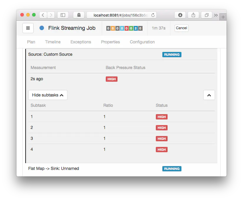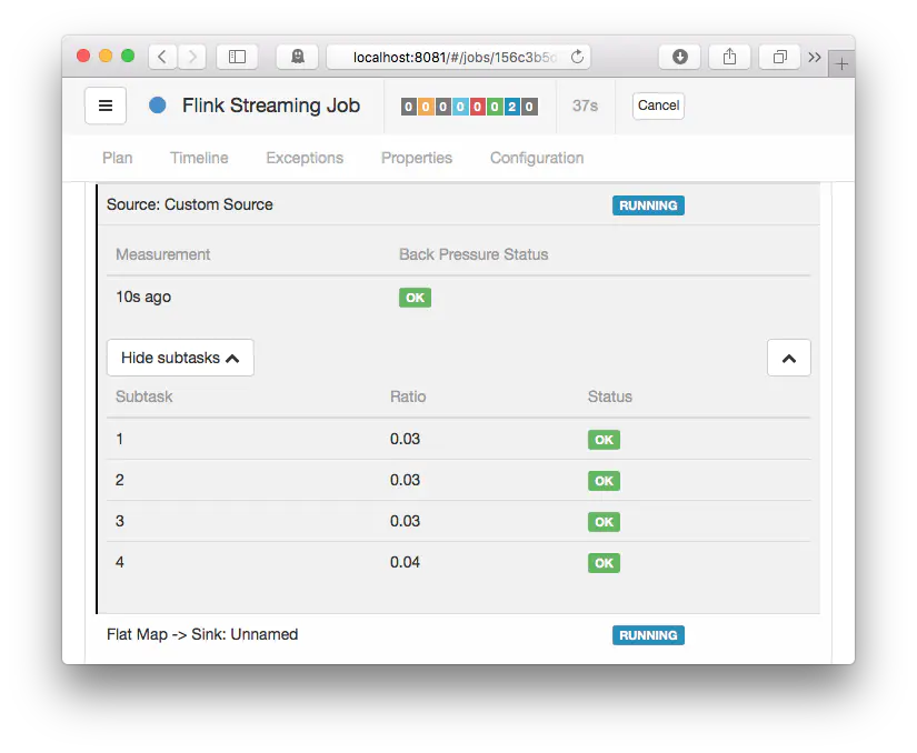 默认情况下,JobManager 每50ms为每个任务触发100个堆栈跟踪,来确定背压。在Web界面中看到的比率表示在内部方法调用中有多少堆栈跟踪被阻塞,例如,0.01表示该方法中只有1个被卡住。状态和比率的对照如下: