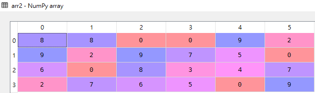 arr2[0] # array([8, 8, 0, 0, 9, 2])