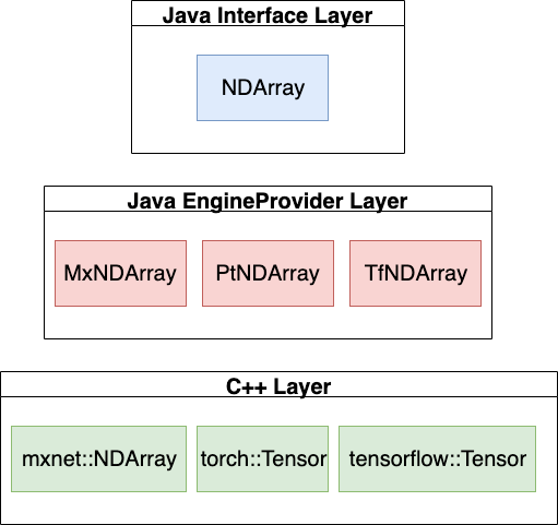 在引擎提供者层 (EngineProvider),是 DJL 各种深度学习引擎为 NDArray 界面开发的包。这个层把原生的深度学习引擎算子表达映射在 NumPy 之上。这样经过这样一层转译,我们在不同引擎上看到 NDArray 的表现都是一致的而且同时兼顾了 NumPy 的表现。