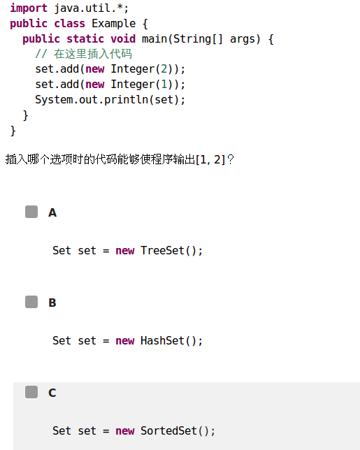LinkedHashSet,用一个链表实现对HashSet类的一个扩展,支持对规则集内的元素排序,排序方式是按照插入顺序进行排序,要强加一个不同的顺序(升序或降序),可以是使用TreeSet。对于本题而言,显然输出会是[2,1]