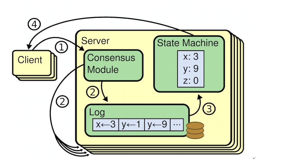 保证复制日志相同就是一致性算法的工作了。在一台服务器上,一致性模块接收客户端发送来的指令然后增加到自己的日志中去。它和其他服务器上的一致性模块进行通信来保证每一个服务器上的日志最终都以相同的顺序包含相同的请求,尽管有些服务器会宕机。一旦指令被正确的复制,每一个服务器的状态机按照日志顺序处理他们,然后输出结果被返回给客户端。因此,服务器集群看起来形成一个高可靠的状态机。