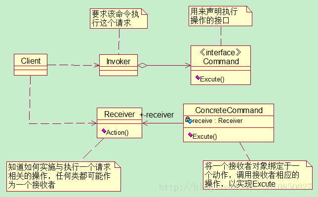 要求命令对象执行请求,通常会持有命令对象,可以持有很多的命令对象。这个是客户端真正触发命令并要求命令执行相应操作的地方,也就是说相当于使用命令对象的入口。