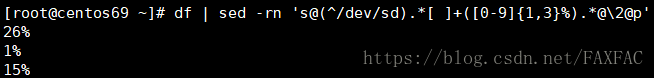 匹配-r 正则表达,-n只显示匹配到的,s@@@替换,匹配开头是/dev/sd的中间无所谓, 空格一次多次,0-9匹配1-3次加%后面不关心,替换为第二个()的东西显示出来。