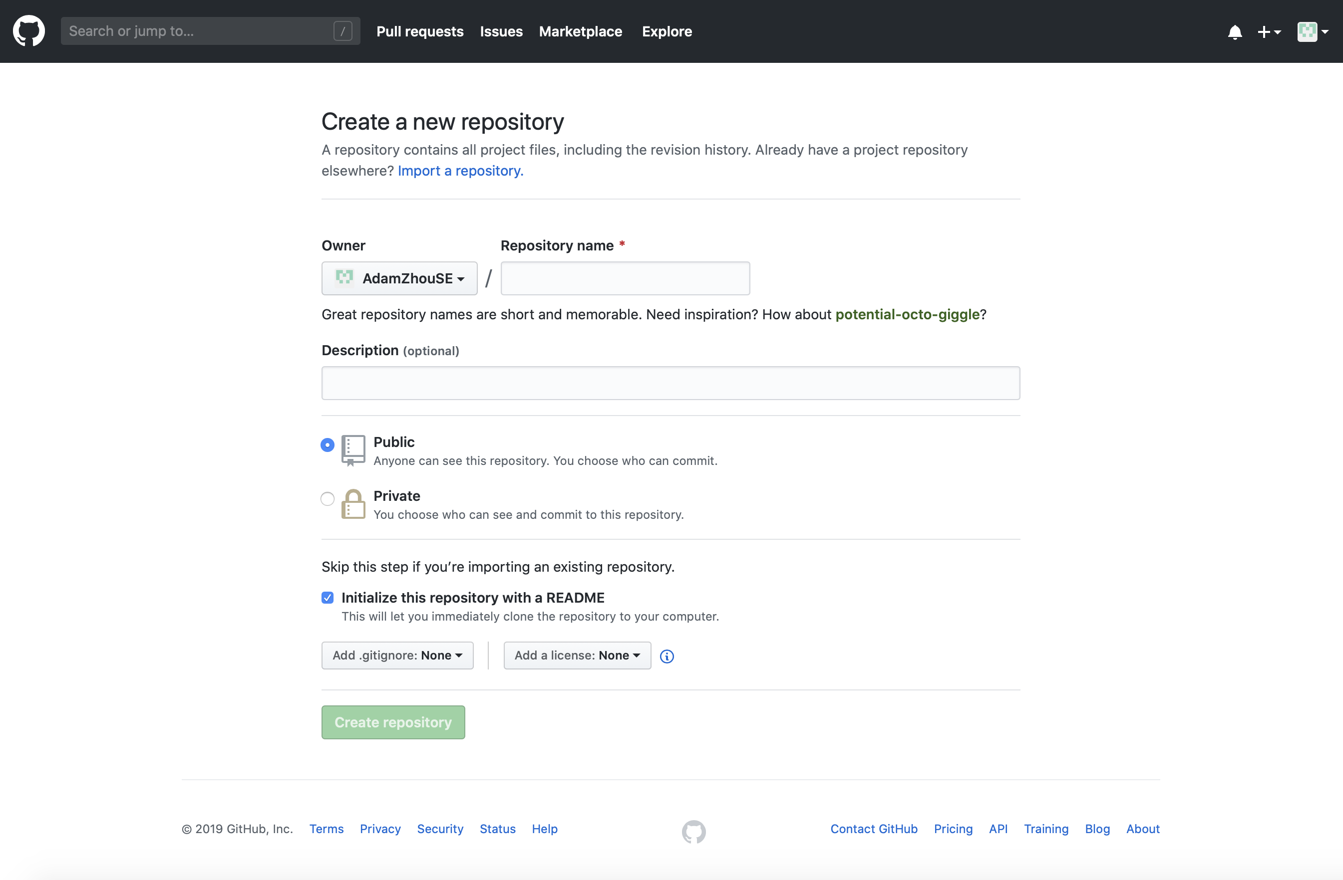 注意仓库名为github的用户名.github.io,勾选readme