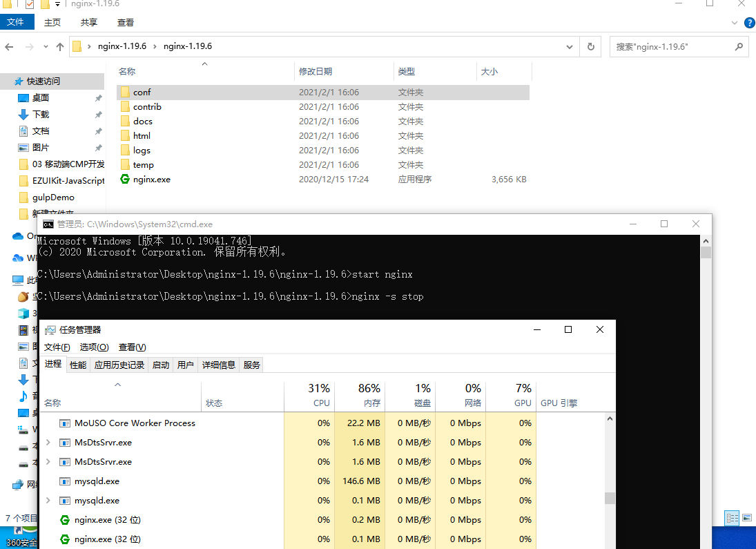 注意:一定要在任务管理器中查看nginx启动情况,如果运行多次并没有执行停止命令,可能会导致缓存问题,我亲身项目配置中遇到过这种问题。