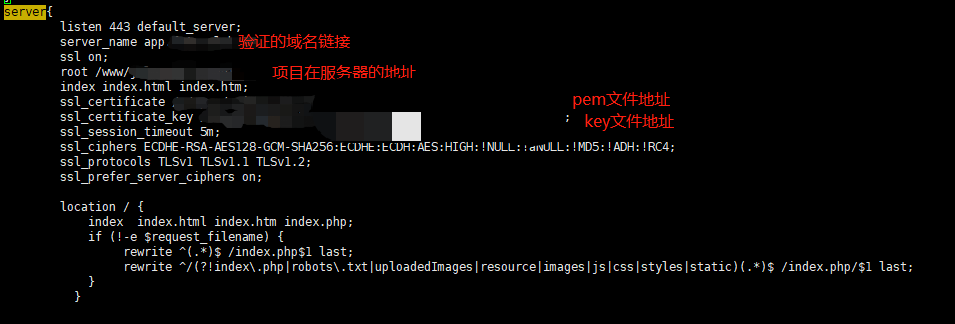 接下来就需要去nginx.conf的server中配置ssl证书地址和编译语言(php)了~