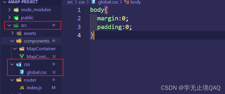 7.在src目录下创建css目录,css目录下再创建global.css文件,代码如下: