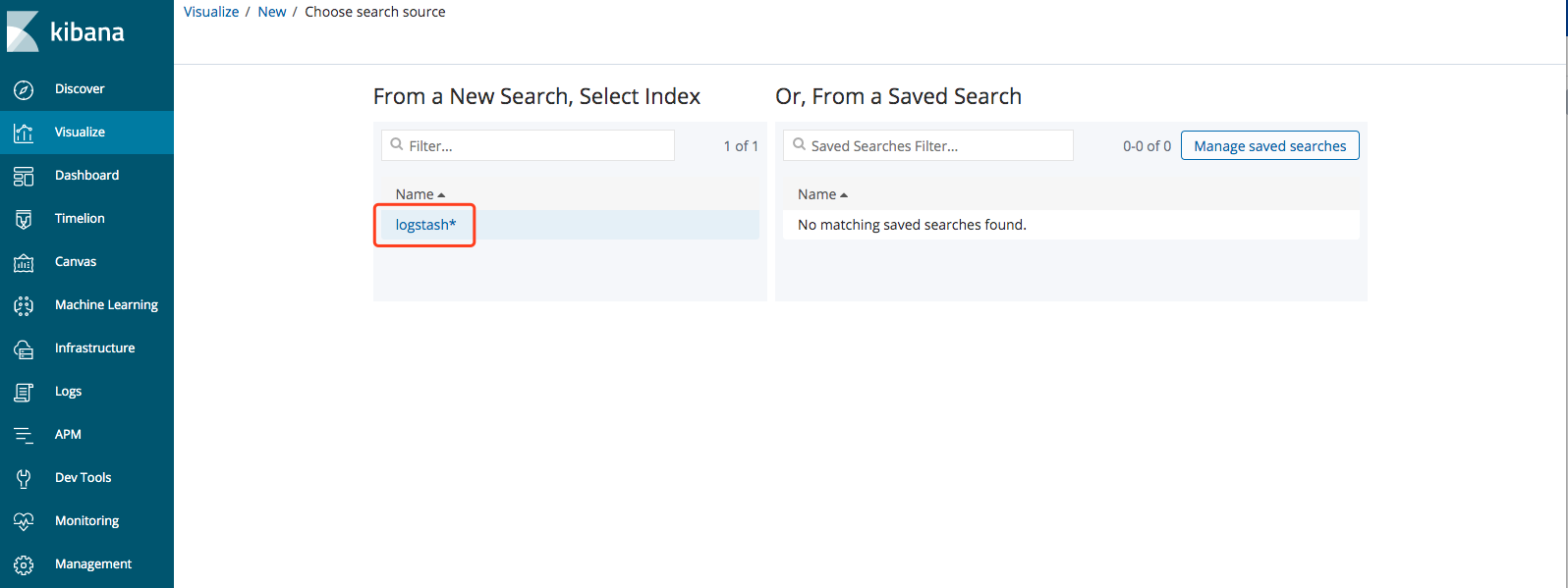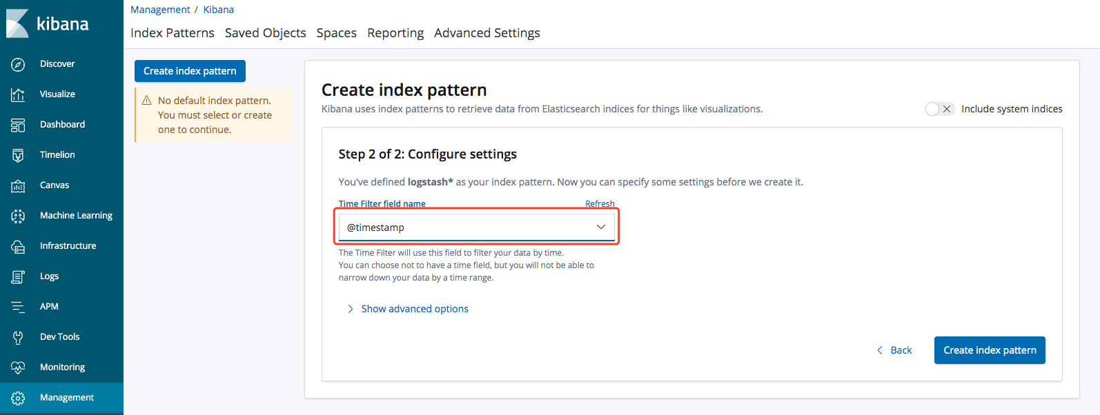 设置Index Patterns,创建logstash*,选择@timestamp作为Time Filter field name