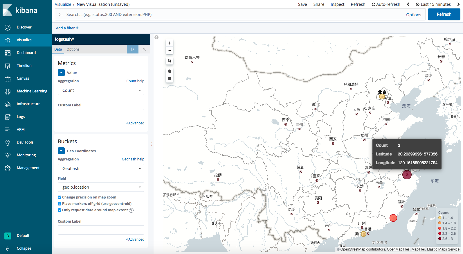 创建visualizations,选择coordinate Map类型,把logstash*选为分析对象,在左侧GeoCoordinates修改选项就可以看到IP来源分布图