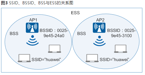 - 扩展服务集ESS(Extend Service Set):由多个使用相同SSID的BSS组成。
