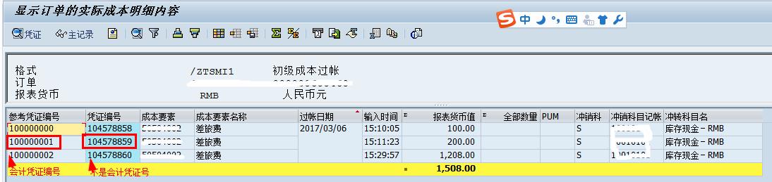 事务码S_ALR_87012993 执行后,可以得到报表,显示出某一个内部订单里面归集了哪些会计凭证