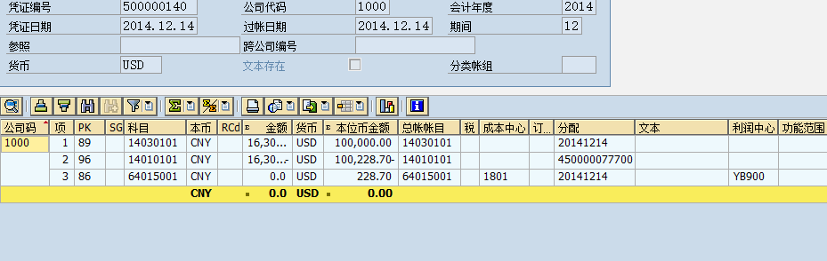 例如:12.14日我们采购入库了 100 PC ,价格10USD 。但本位币为NTD,入库金额 ,GR/IR都为NTD。