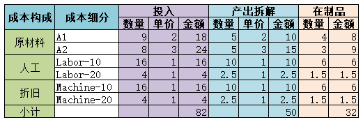 为了详细分析差异,还要将账面价值也要按照成本明细项进行细分,而账面总价值32元也需要细分,需要将转出的完成品金额也按照标准成本滚算时的成本明细项进行细分。