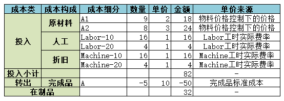 比如下图的订单,要生产10个完成品A,已经投入了8个产品的料、工、费(其中原材料A1和A2标准定额都是1个),已入库5个完成品,根据系统逻辑计算得到在制品金额为32元。