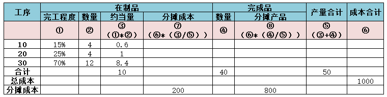 从上表可以看出,约当产量法是以最终完成品为比较基准,结合每个工序的完工程度,计算出约当量。经过这样的转换计算,所有在制品和完成品被体现为可以同等计量的数量,于是就可以将总的成本(包括上期期末遗留成本和本期发生的成本)按照各自数量所占的份额分摊到在制品和完成品上。