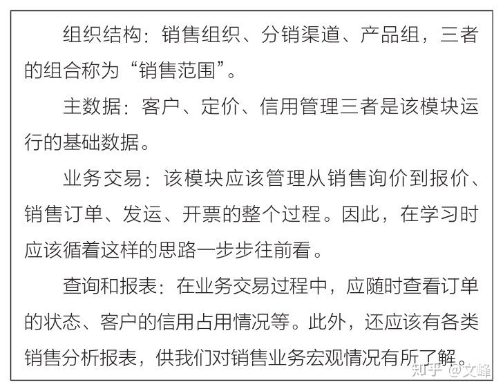 如1.3.1小节所讲,学习SAP的每个模块,都要先了解其框架体系。因此表1-9的框架体系尤为重要,可以循着这样的框架体系来了解每个模块的细节知识。以业务知识作铺垫,再学习系统,会起到事半功倍的效果。