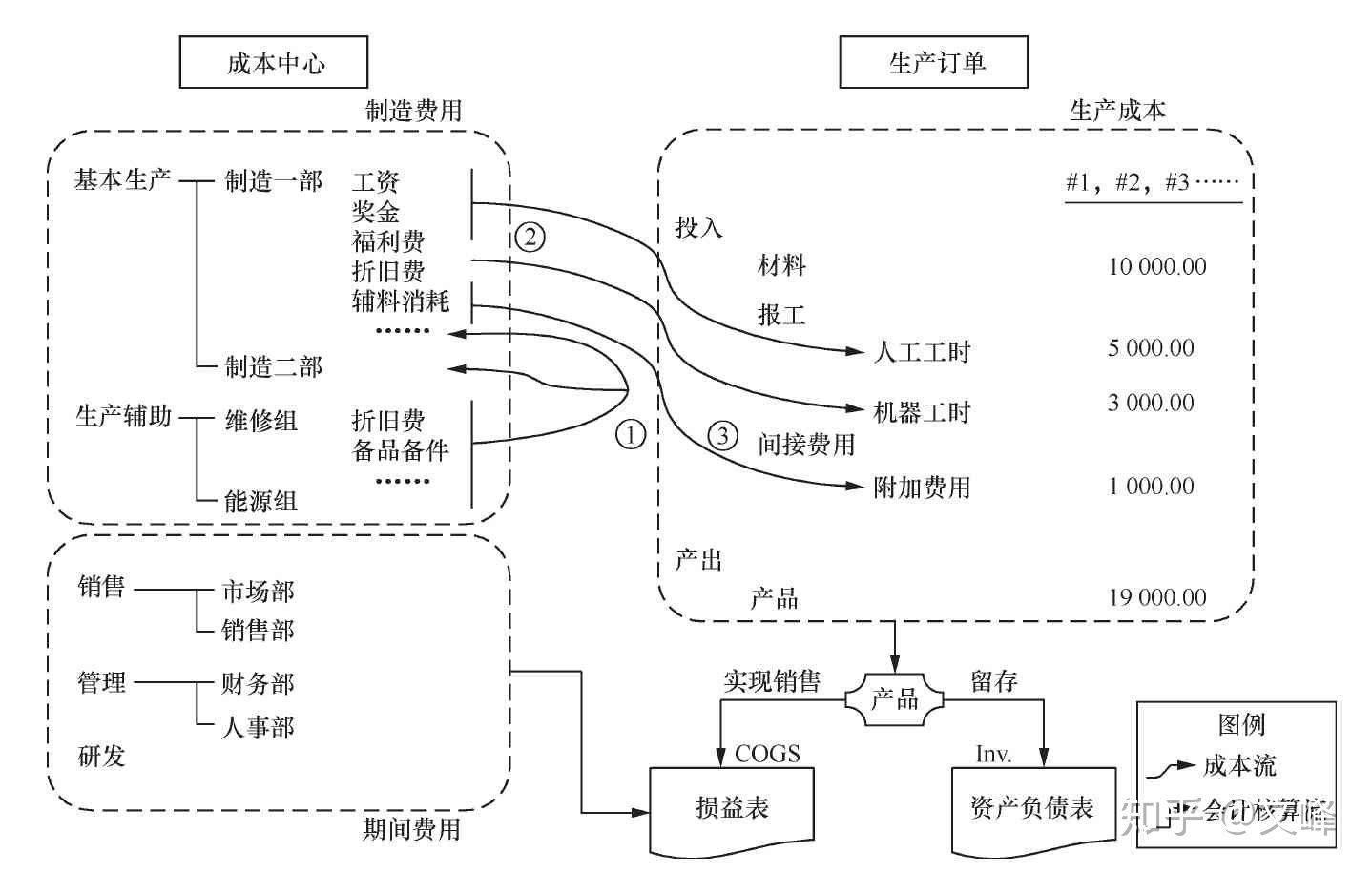 CO模块下最主要的子模块是成本中心会计(CCA)模块和产品成本控制(PC)模块。可以这样理解这两个模块:企业的成本绝大部分发生在各个部门(即成本中心)和生产订单上。发生在管理类和销售类成本中心的费用直接进入当期的损益,体现在利润表中;而发生在制造类成本中心的费用最终会通过各种途径进入到生产订单,被生产订单吸收,从而在生产订单上可以归集到完整的料、工、费。这些料、工、费价值最终被订单所生产的产品所承担。产品实现销售,则将结转的销售成本反映到利润表中;产品留存在仓库,则以存货形式反映到资产负债表中,如图1-16所示。