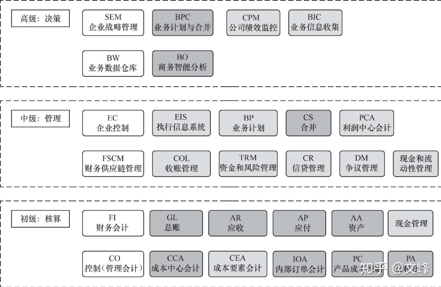 SAP财务相关的模块涵盖了财务的核算、管理和决策多个层面。如果将它们分别看作财务的初级、中级、高级,可以将相关模块显示为图1-12所示。