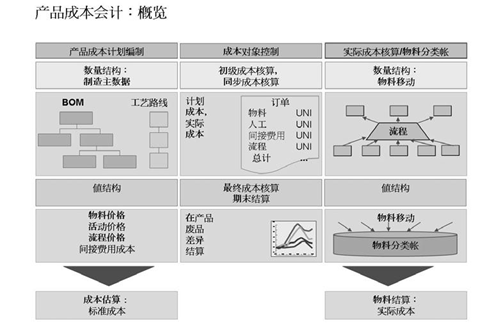产品成本会计”由以三个组件组成:产品成本计划编制,成本对象控制,实际成本核算和物料分类帐。