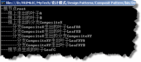 Composite comp = new Composite("根上生出的分支CompositeX"); comp.Add(new Leaf("分支CompositeX生出的叶子LeafXA")); comp.Add(new Leaf("分支CompositeX生出的叶子LeafXB"));