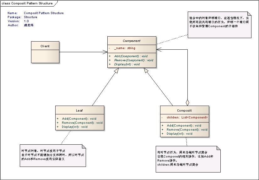 Leaf类:叶节点对象,叶节点没有子节点。由于叶节点不能增加分支和树叶,所以叶节点的Add和Remove没有实际意义。