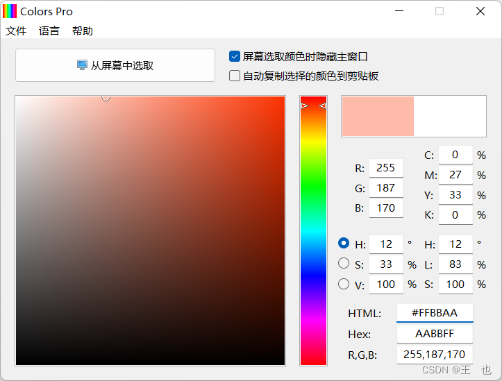 - 因为项目中设置样式表时,有时去别处取颜色但不太好知道它的 rgb 值,所以这里介绍一款屏幕颜色吸取工具 Colors Pro,希望大家能用上,可官网自行下载,运行效果如下