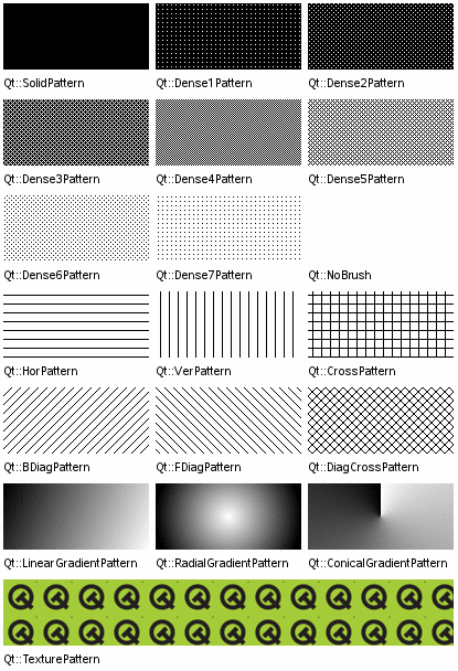 画刷的style()定义了填充的样式,使用Qt::BrushStyle枚举,默认值是Qt::NoBrush,也就是不进行任何填充。我们可以从下面的图示中看到各种填充样式的区别: