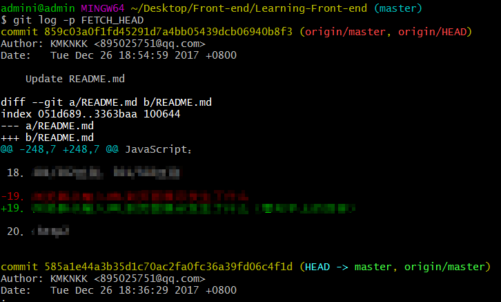 取回更新后,会返回一个FETCH_HEAD ,指的是某个branch在服务器上的最新状态,我们可以在本地通过它查看刚取回的更新信息: