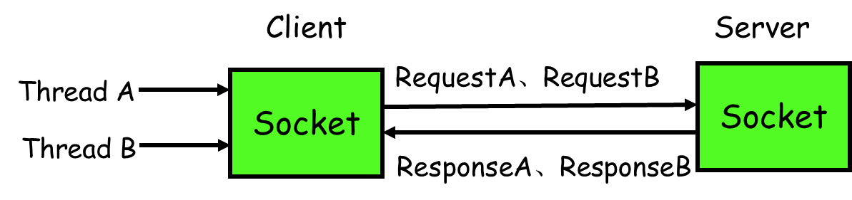如下图所示,线程A和线程B同时向client socket发送请求requestA和requestB,socket先后将requestB和requestA发送至server,而server可能将responseA先返回,尽管requestA请求到达时间更晚。我们需要一种机制保证responseA丢给ThreadA,responseB丢给ThreadB。
