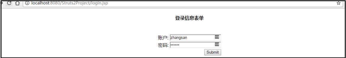 页面只有一个表单,运行项目,进入该页面,写入数据后点击提交按钮,通过Struts 环境逻辑处理响应相应的结果。