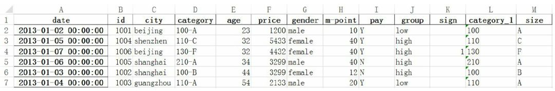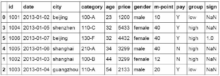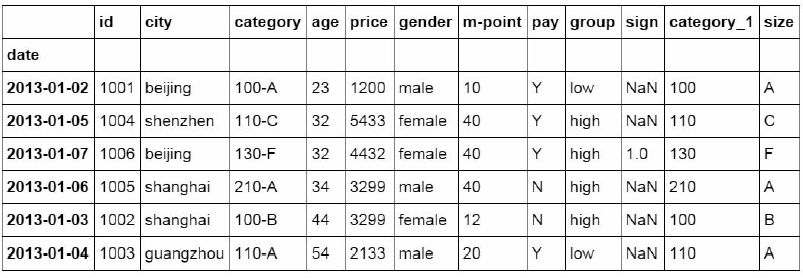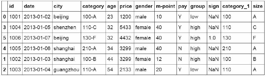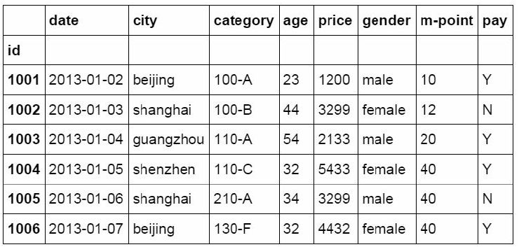Index(['id', 'date', 'city', 'category', 'age', 'price'], dtype='