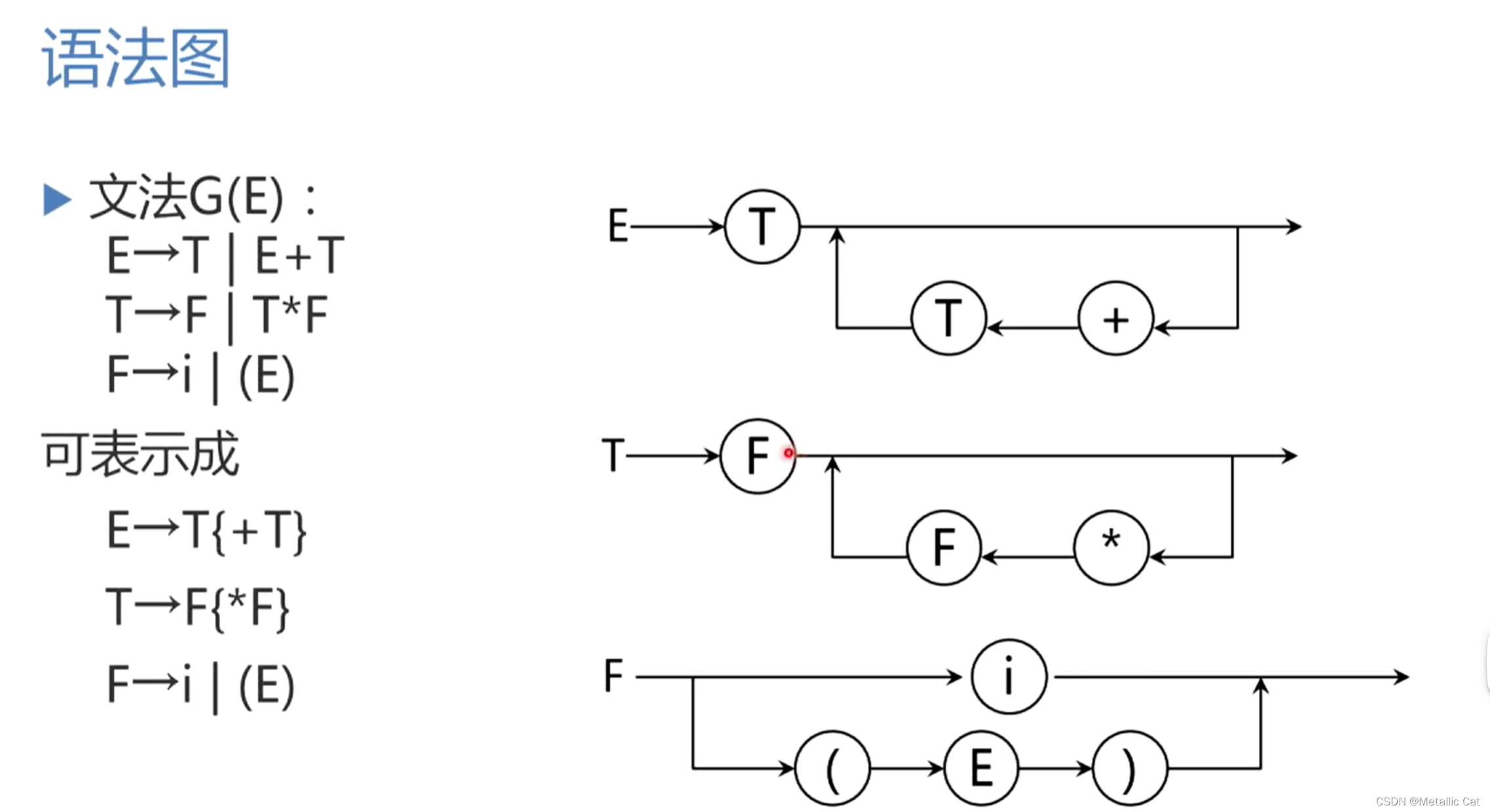 4.对于E非终结符而言,如果递归能够停止的话,得到的字符串的开头字符一定是T,而T的后面一定跟着若干个 +T ---- 这种形式等价于 T然后后面跟着 +T的闭包 --- 其实就是扩充后的巴克斯范式的表示 --- 而扩充后的巴克斯范式的语法图就是上图右边那样